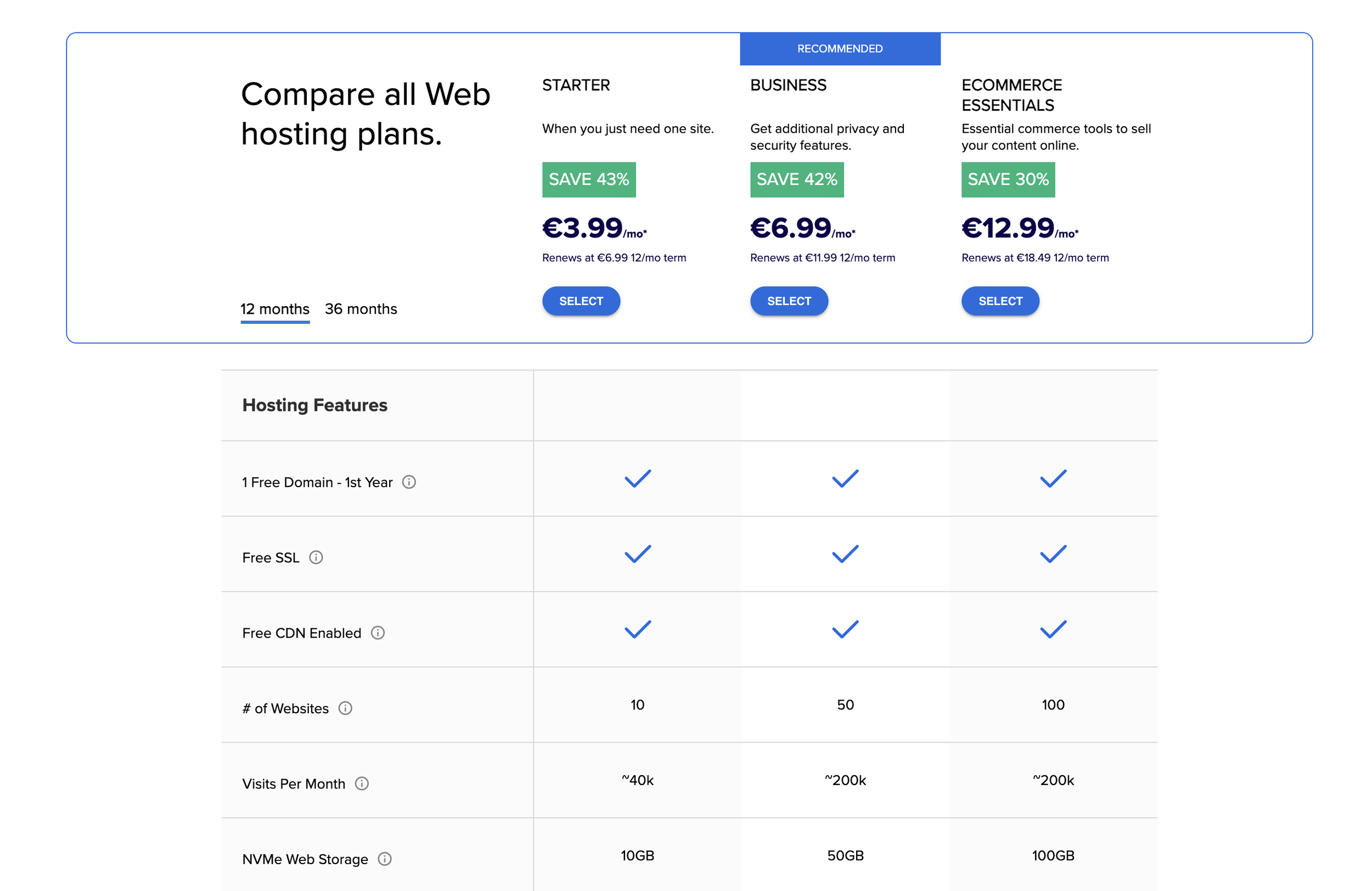 The platform offers 3 standard hosting plans, as well as two eCommerce plans.