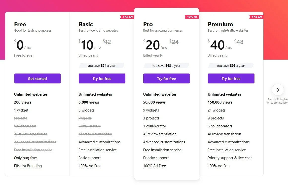 Although it’s limited, you can add one widget to your website for free, ideal if you have a small website or want to give Elfsight a try first.