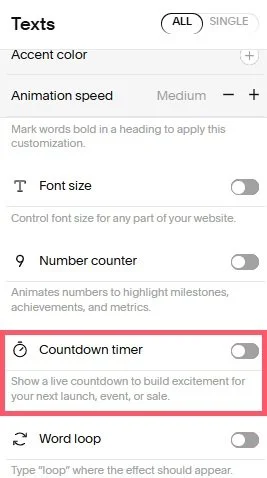 Select the Texts category and scroll down to Countdown timer to toggle it on.