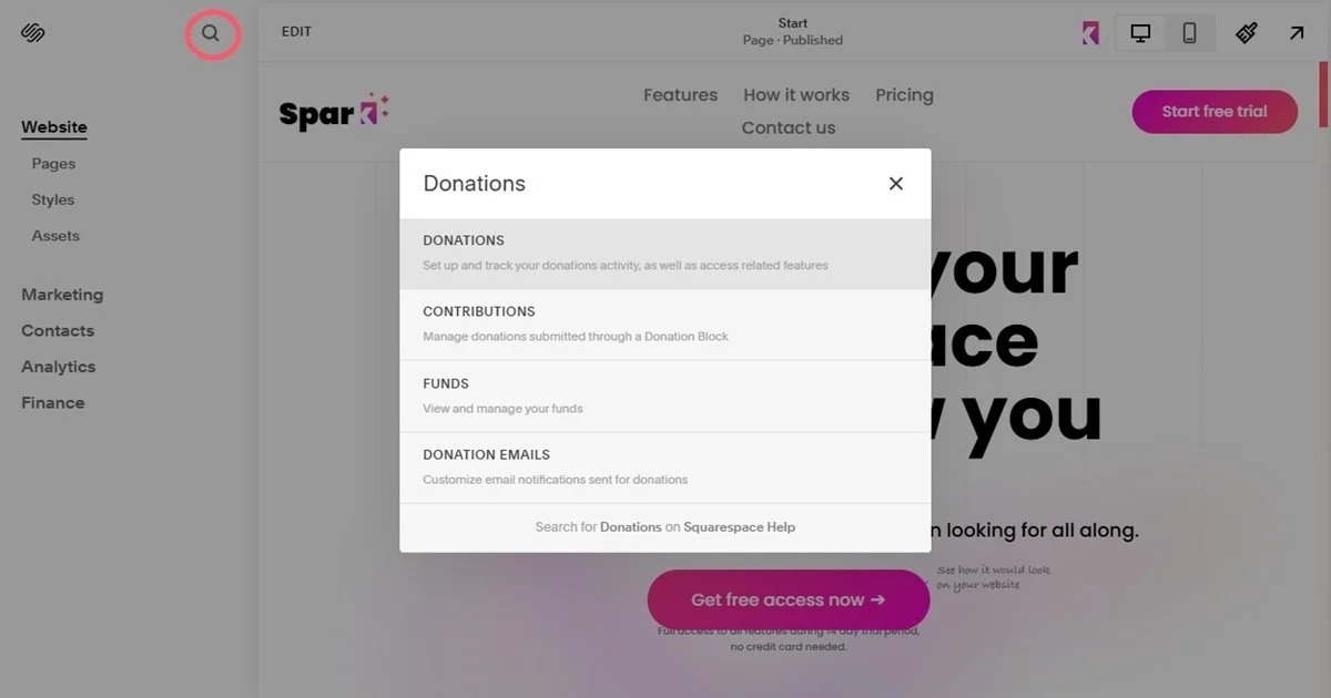 If Donations isn’t in your sidebar menu, click the Search icon in your Squarespace menu and type Donations to bring up the Donations menu.