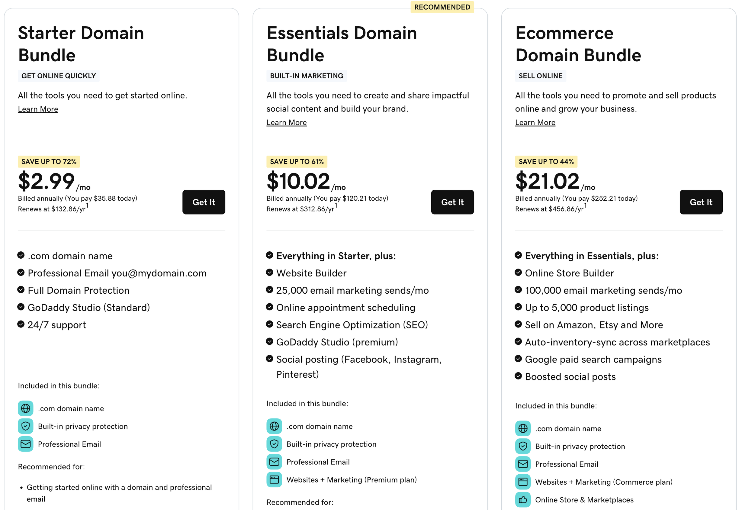 GoDaddy offers 3 pricing tiers, ranging from $2.99 to $21.02 a month. This makes it an affordable option for businesses that have a small budget or want to see if there’s demand for its products and services.