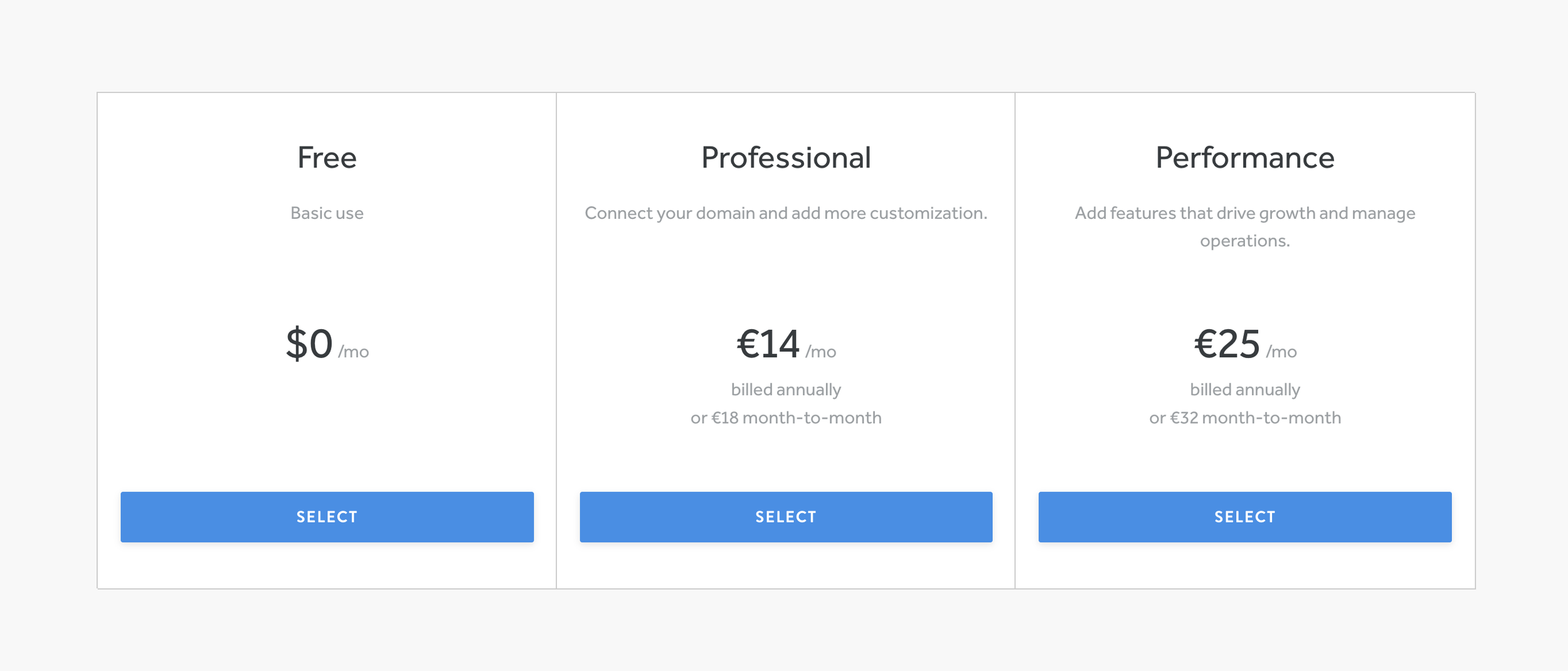 Squarespace doesn’t offer a free plan, although you can take advantage of a free 14-day trial before you buy. There are four different tiers on offer, with prices ranging from $17 to $79 a month.